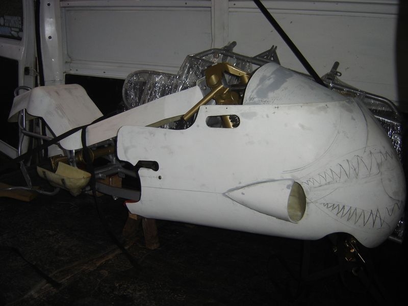 Nous nous dirigeons ensuite vers le garage où la bête est tapie. Nous la découvrons au propre comme au figuré. A notre grand étonnement, nous trouvons un châssis fraîchement sorti de peinture, trois roues, des coques en polyester brut, un moteur ...et quelques pièces1. Houla, il y a encore du travail !