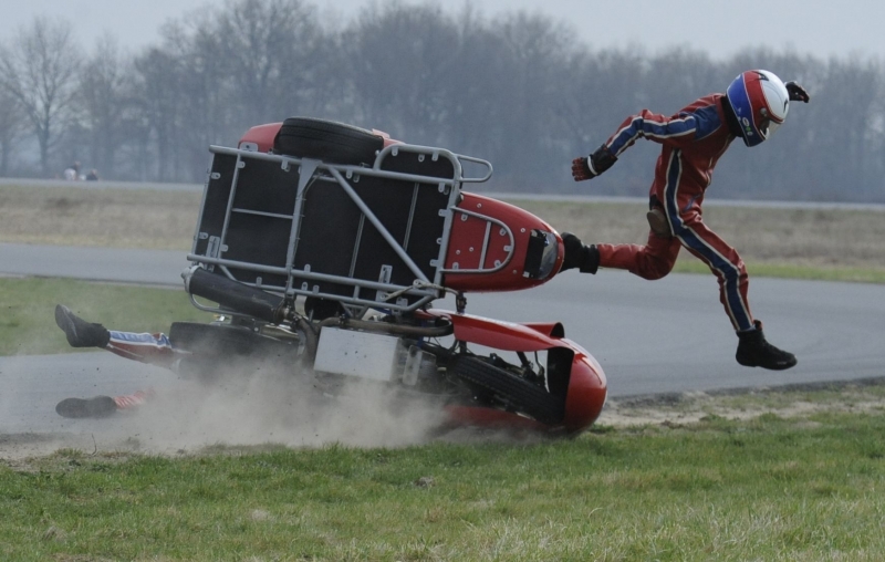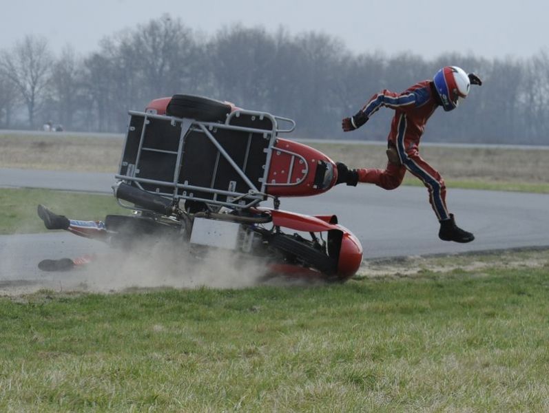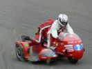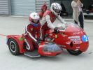 1° Manche : La piste est sèche mais les nuages menacent encore. Au feu vert nous partons comme une balle et passons les 9 sides devant nous. Premier virage et POF ! Plus rien ! On s'arrête en bord de piste et les commissaires nous font signe de nous ranger. Je lève mon bras et William voit le coupe circuit qui pend à mon bras. Remise en place et reprise de la course. Là, faut plus nous chercher et après une belle remontée, nous finissons 11ème au scratch et 3ème Vintage.